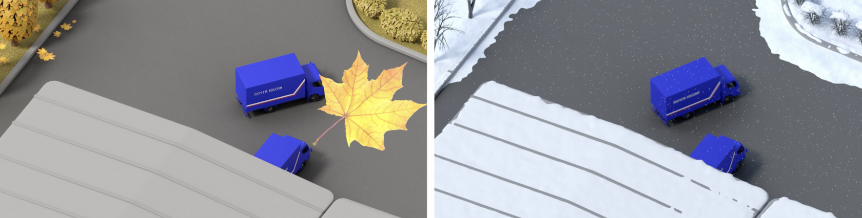 Всего было сделано три сезонные итерации под различные мероприятия. Мы добавляли снег, осенние листья и меняли цветосхему ролика.