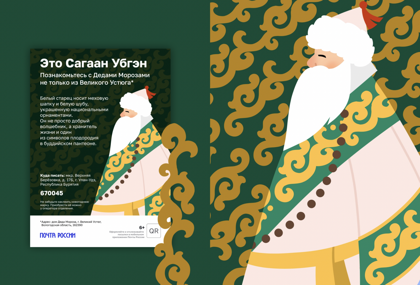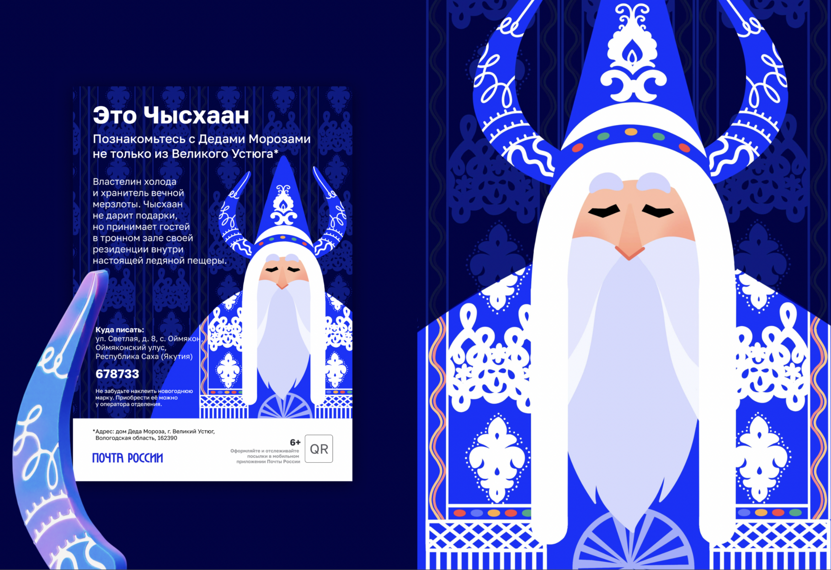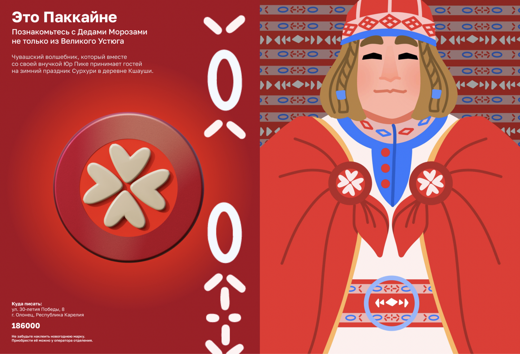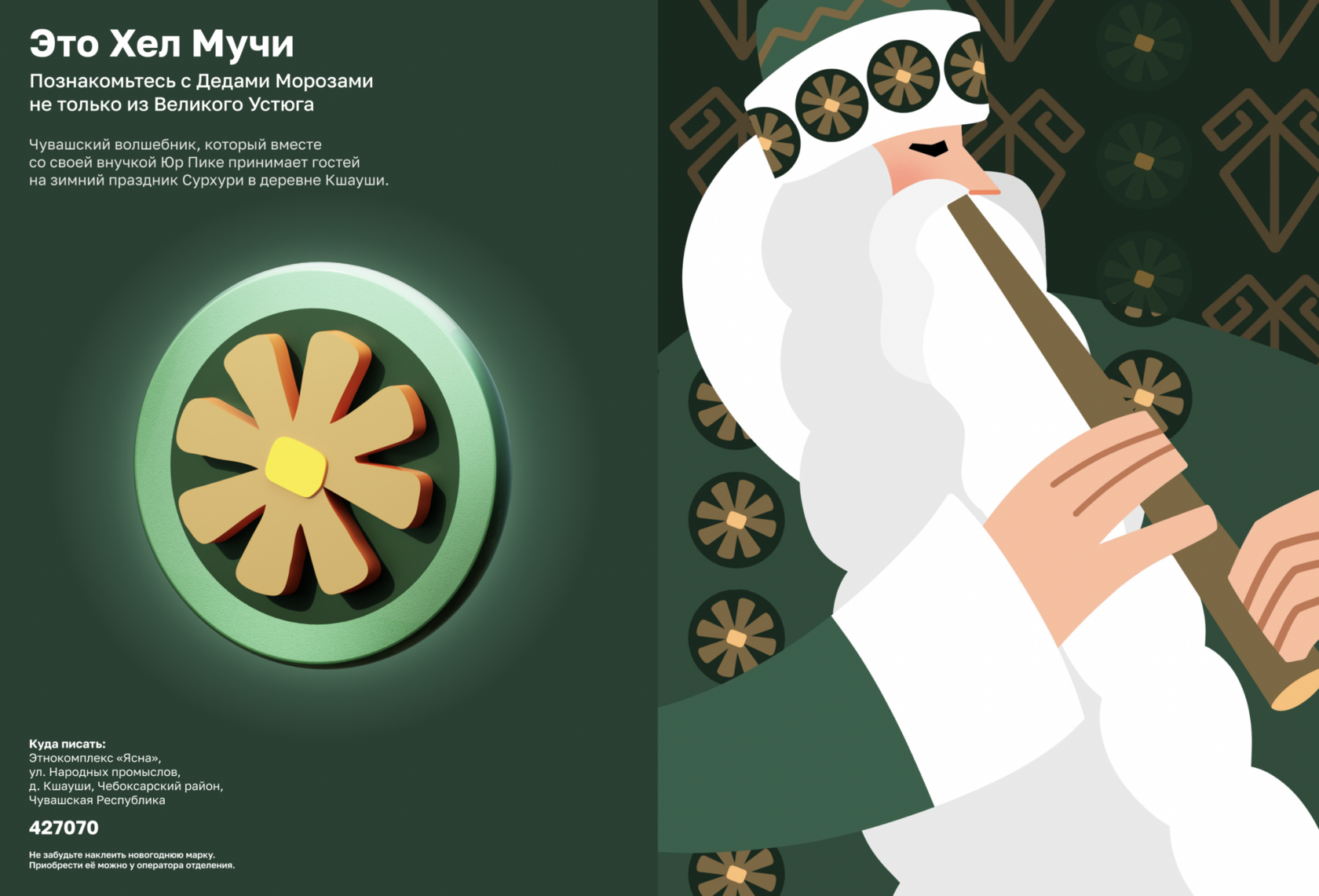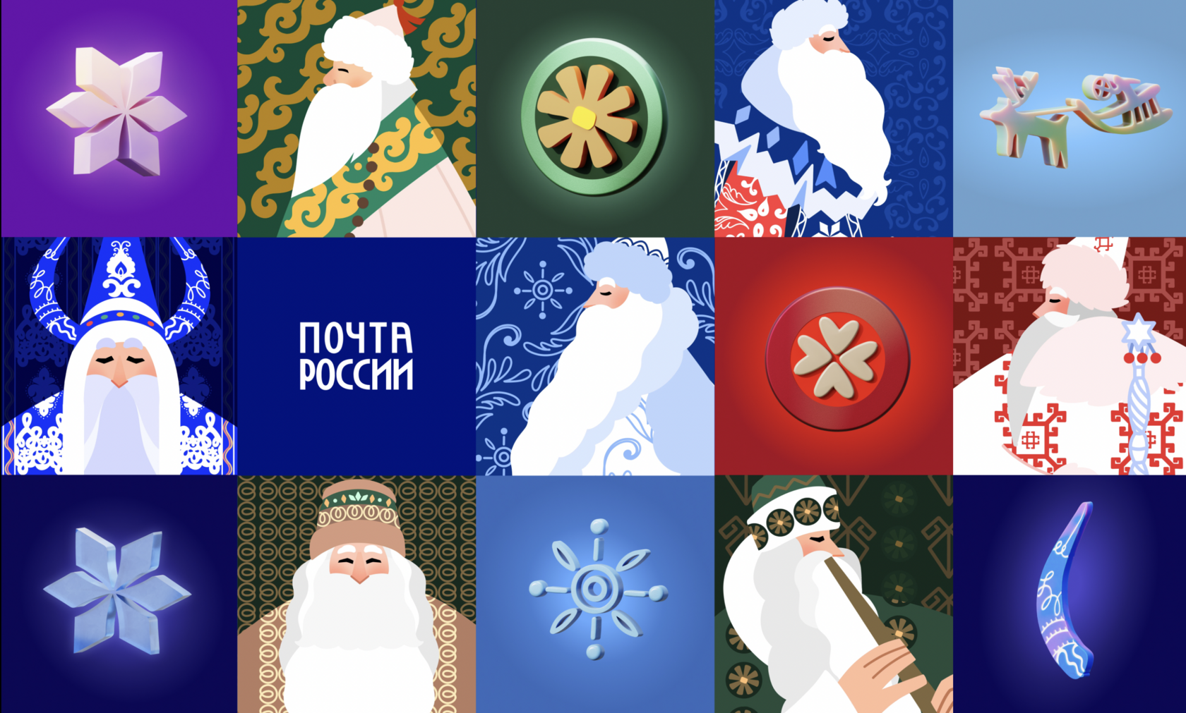 Проект придуман ещё несколько лет назад, чтобы познакомить детей из разных регионов страны с Дедами Морозами не только из Великого Устюга, но и с региональными волшебниками. В 2024 году мы решили пересмотреть визуальный концепт проекта, и получилось создать паттерны и артефакты на основе одежды персонажей. Которые легли в основу плакатов, стендов и рекламной кампании.
