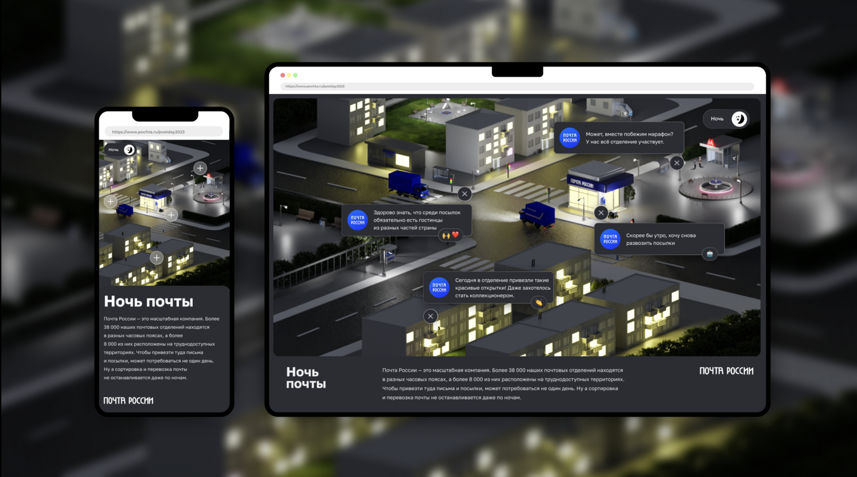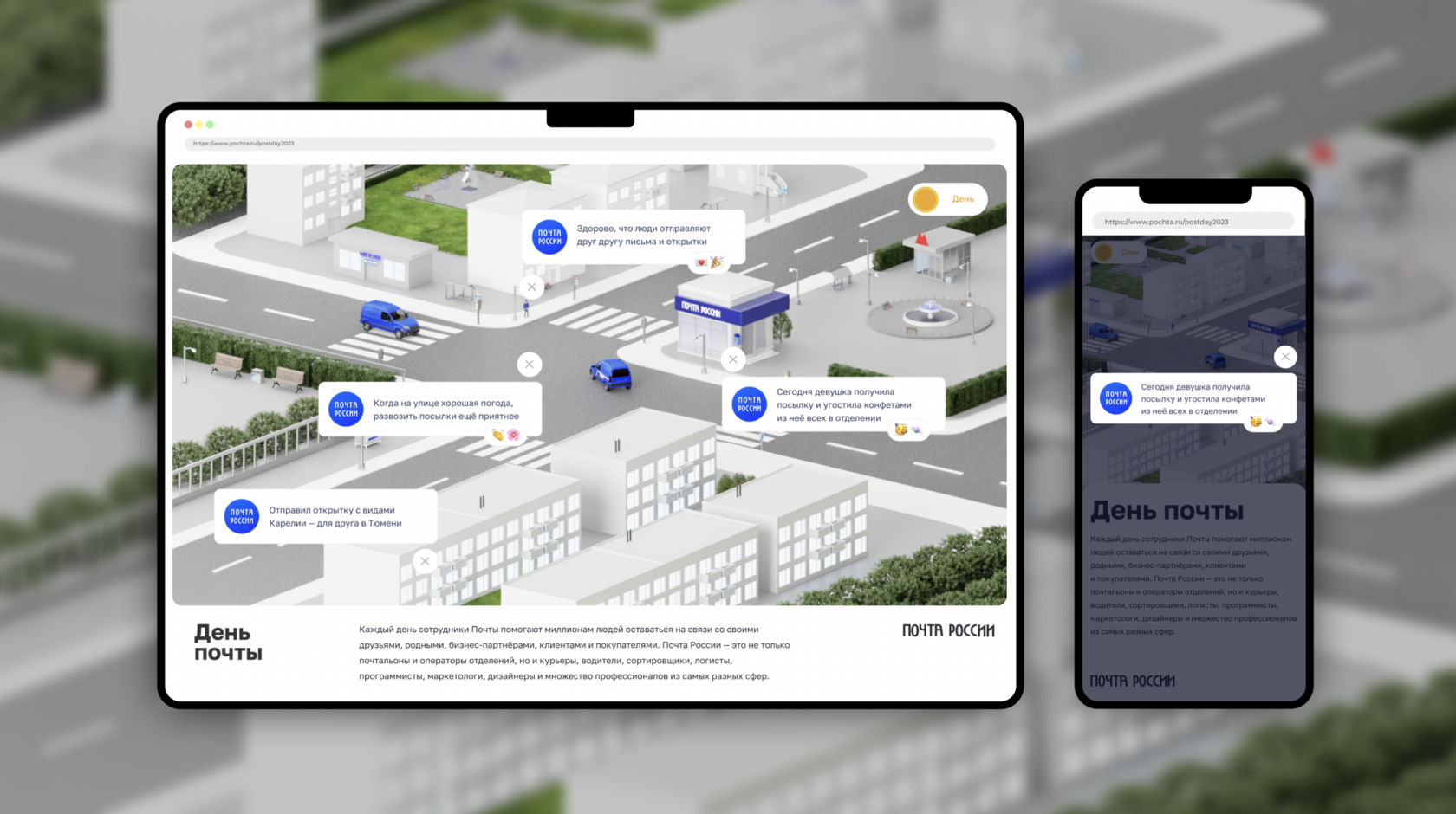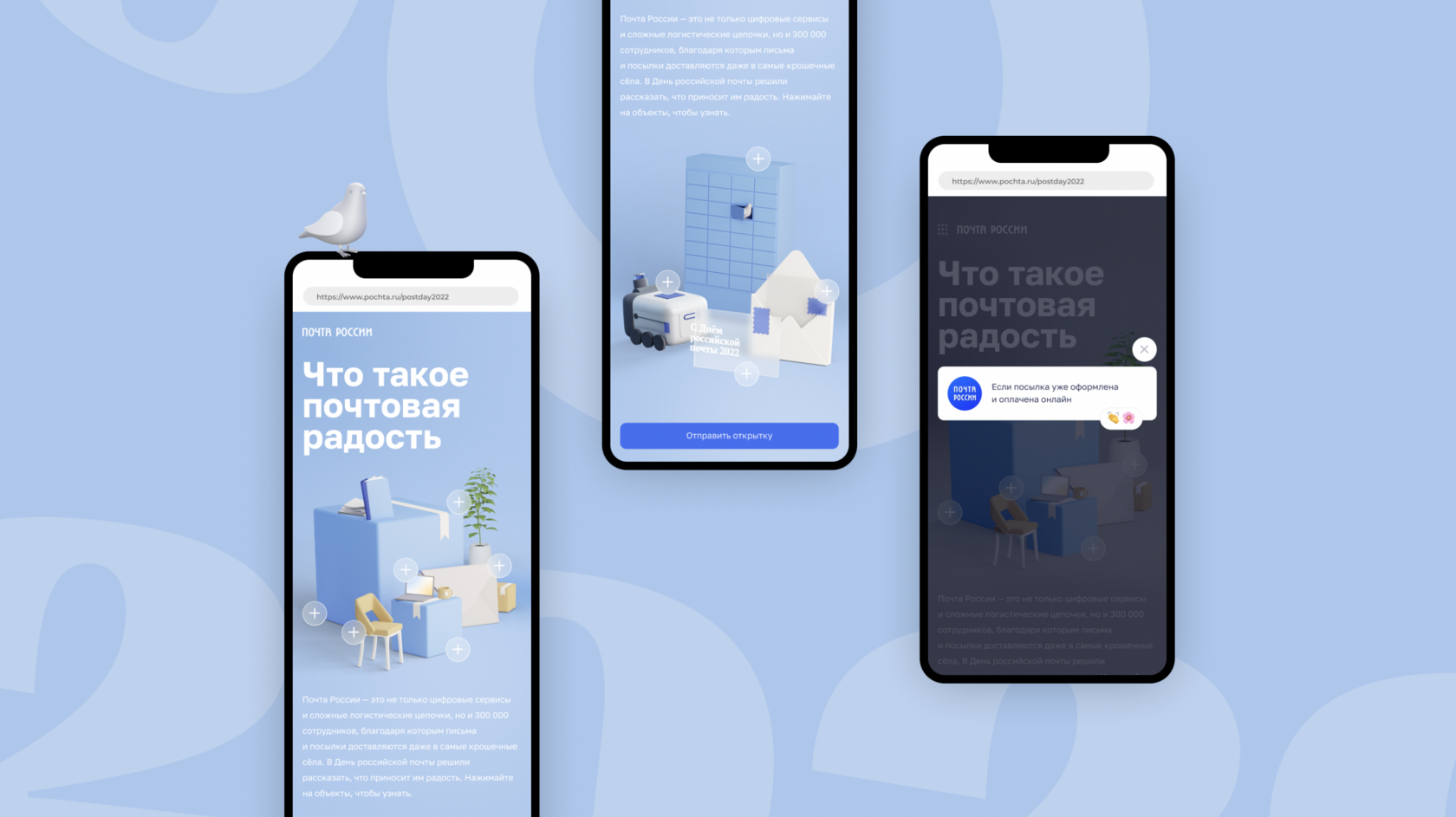 Ежегодный спецпроект Почты России посвященный Дню Российской и Международной почты. Цифровая открытка для повышения узнаваемости Бренда, а также очеловечивания сервисов компании.