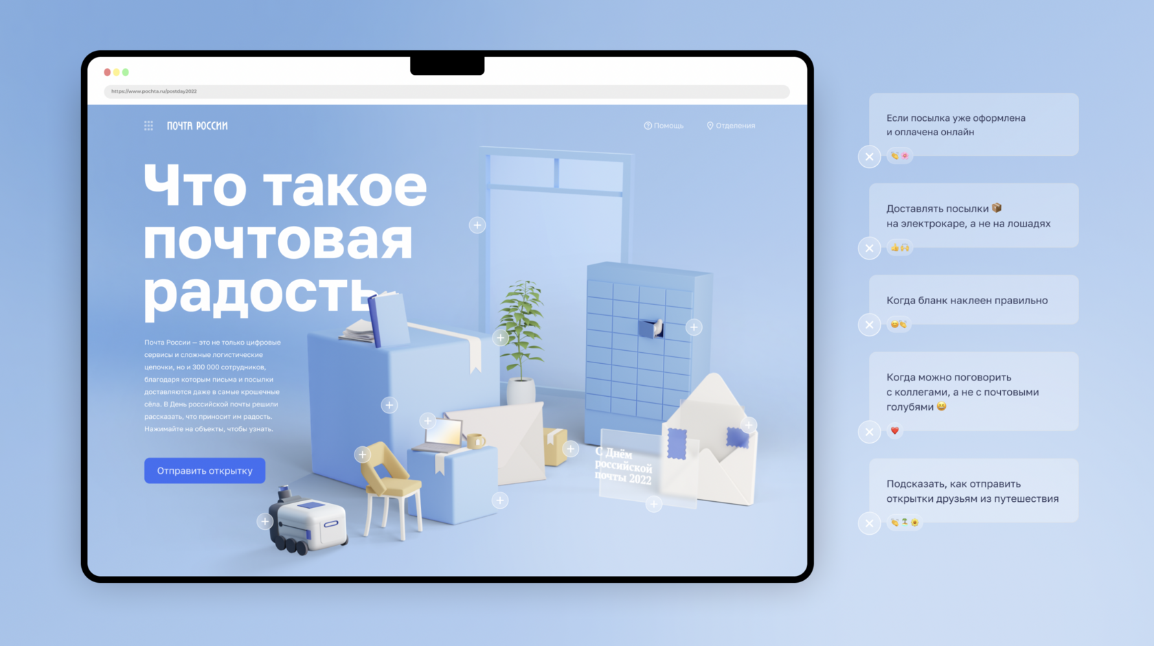 В 2022 году мы решили сделать проект-открытку от лица наших сотрудников. Что такое почтовая радость? Проект-исследование не лишённый самоиронии. И самое важное – это напомнить пользователем, что за каждой коробочкой, экраном приложения, машиной или ровером стоит живой Человек со своими маленькими радостями.