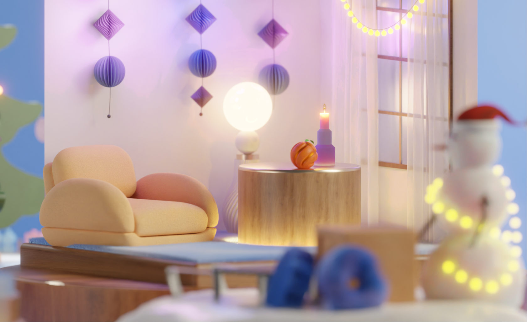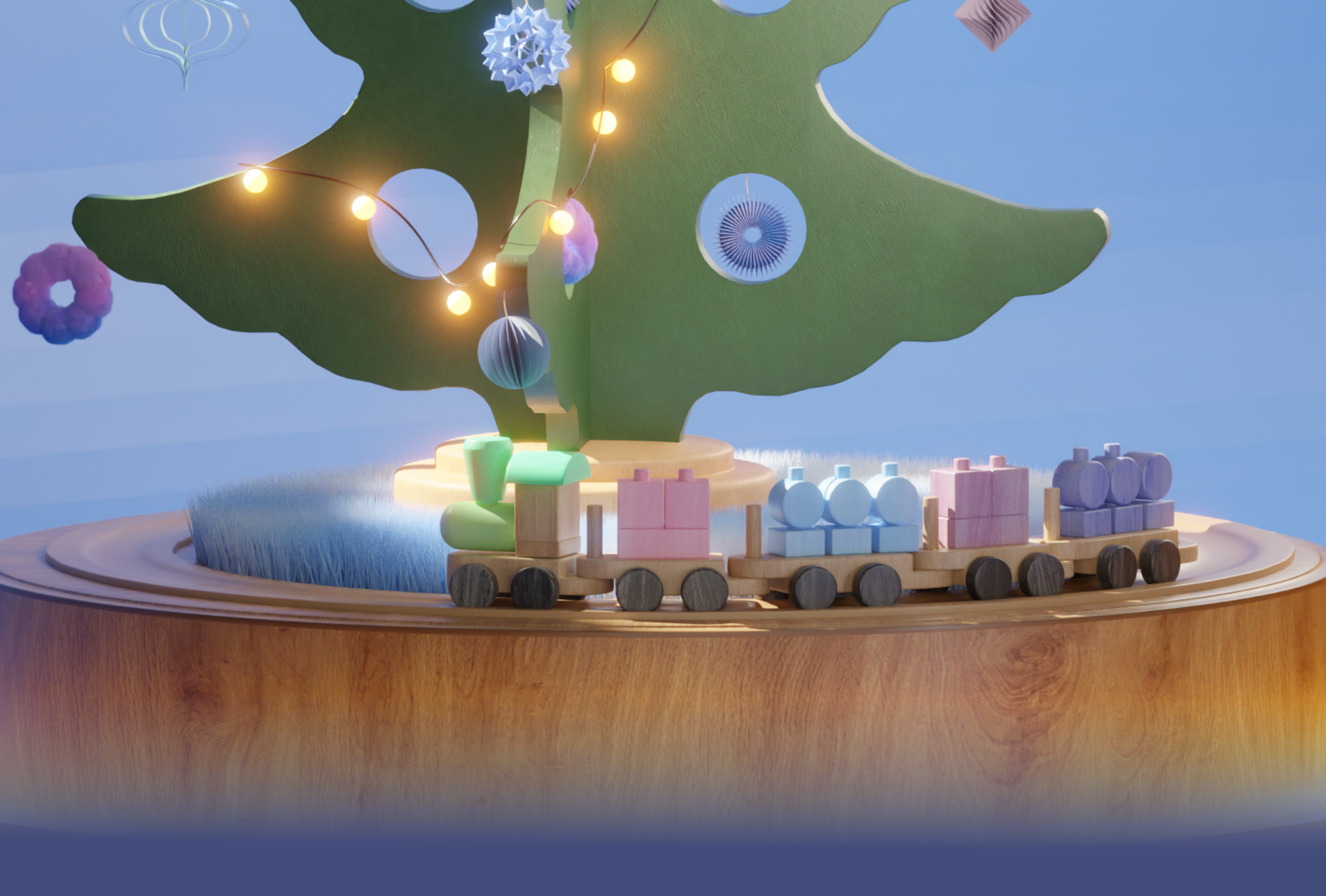 В этом году мы снова продолжаем «заигрывать» с эстетикой детских ёлочных игрушек, но решили пойти глубже и всю сцену превратить в волшебную шкатулку. На переднем плане продуктовая коробка Почты России превращается в предвестник волшебства, так как именно оттуда появятся все подарки и украшения, которые преобразят пространство вокруг.