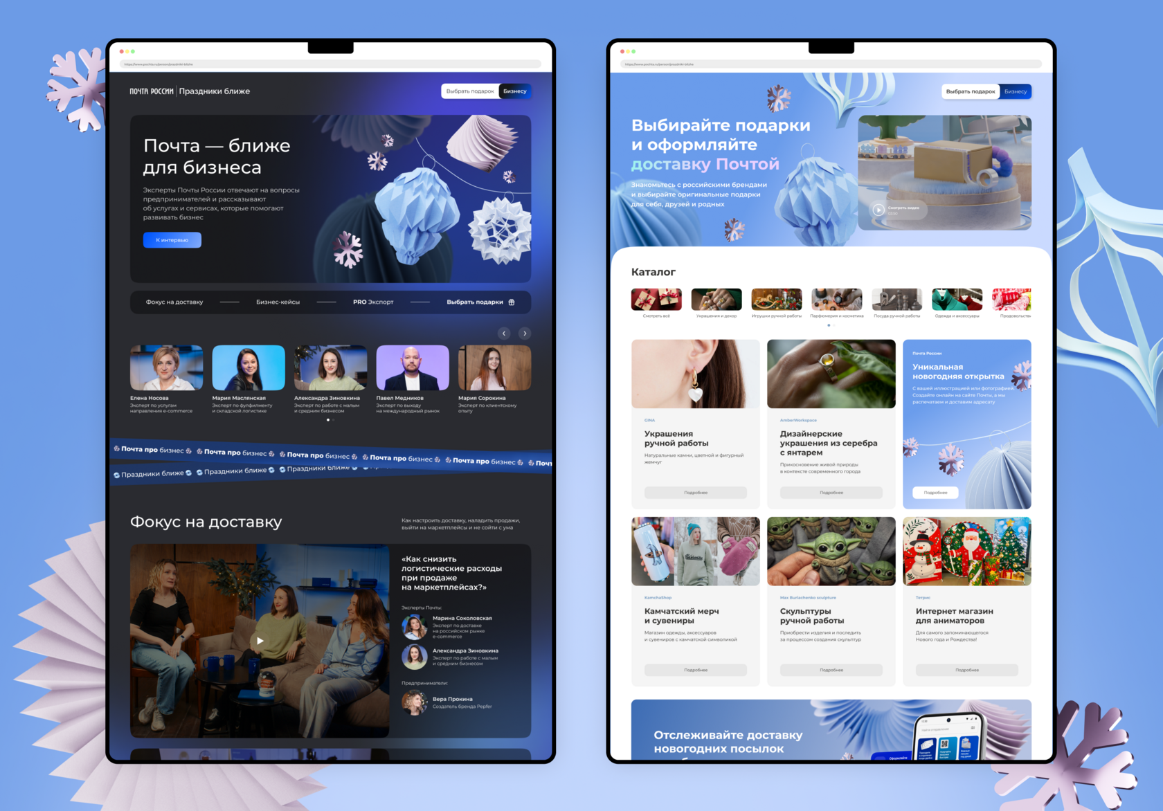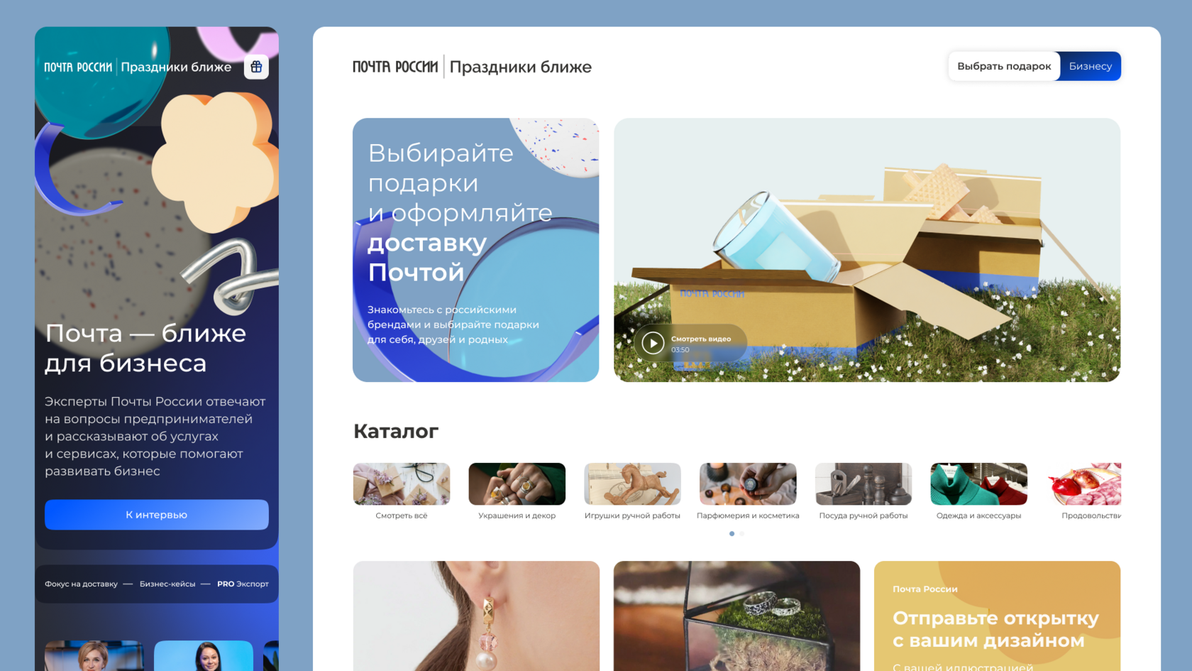 Ежегодная кампания 360. В предверии горячих сезонов Нового года и гендерных праздников мы хотели поддержать предпринимателей и рассказать, какие новые услуги для бизнеса запустила Почта. Поэтому весь проект строится на тематических разделах B2B (информация о продуктах для бизнеса) и B2C (тематический маркетплейс с доставкой от Почты России)